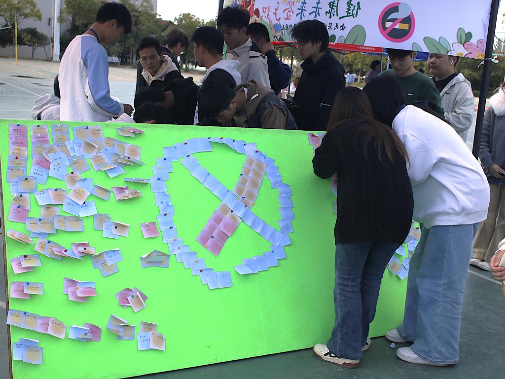 “便签贴贴乐”中,同学们宣扬禁烟标语,以笔尖划过纸张的沙沙声交织成热闹的氛围。写满禁烟标语的便签被贴满墙面,形成禁言标识。用指尖传递的温度,让禁烟的约定化作校园里看得见的温暖风景。