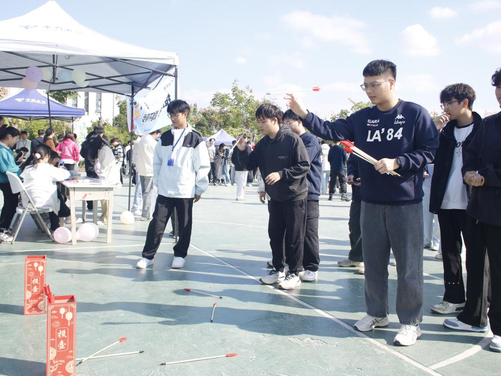 “投壶传情”,同学们屏息凝神,抬手瞄准壶口释放箭矢,每一次投掷都引来现场的轻声关注。箭矢入壶时,众人拍手喝彩,即便未能投中,在鼓励声中,大家也会接过新箭再次尝试,将对健康的期许融入一次次投掷里。