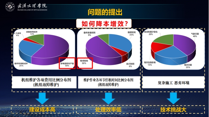 讲座伊始,盛余洋老师从“双碳” 目标下的能源转型趋势切入,结合国家 “十四五” 规划中对绿色低碳发展的明确要求,引出海上风电作为清洁能源领域的重要方向其发展价值与现实意义。她提到,当前全球海上风电装机量持续攀升,我国更是在东部沿海地区加速布局,但海上风电运维面临着建设成本高、处理效率低、技术挑战大的三重难题——仅机组故障维护中,发电量损失产值就占比58%,等待维修时间在整体运维周期中占比超50%,恶劣海况还会进一步加剧运维难度。
